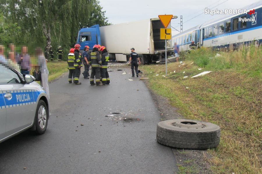 Do tego groźnego zdarzenia doszło wczoraj, około 17.00, na strzeżonym przejeździe kolejowym przy ulicy Rybnickiej w Czerwionce-Leszczyny. Z ustaleń policjantów z wydziału ruchu drogowego rybnickiej komendy wynika, kierujący ciągnikiem siodłowym z naczepą – 52-leni obywatel Ukrainy, jadąc w kierunku ulicy Polnej, nieprawidłowo wykonał manewr skrętu w prawo. Kierujący zmuszony był do korekty tego manewru. Kiedy naczepa samochodu ciężarowego znajdowała się na przejeździe, kierujący nie zauważył, że półzapory zostały opuszczone. Nadjeżdżający pociąg relacji Katowice-Praga, uderzył w końcową część naczepy z której wyrwane zostały drzwi oraz koło zapasowe. Toczące się koło, uderzyło w stojący przed przejazdem kolejowym samochód osobowy marki Fiat.