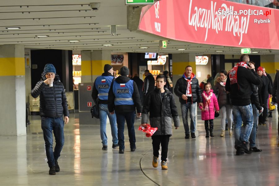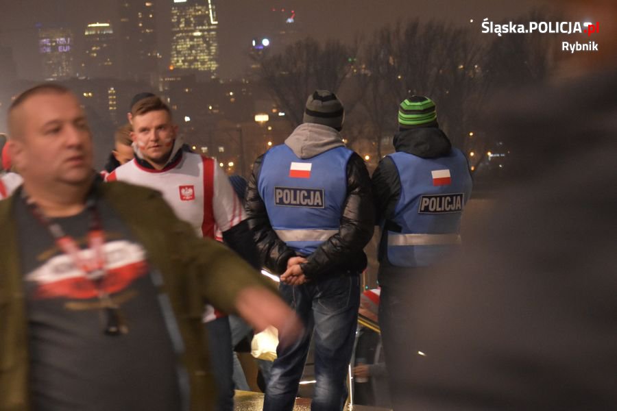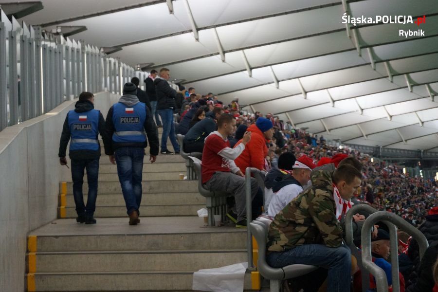 Dziś dzień meczowy! O 20.45 na Stadionie Narodowym zostanie rozegrany towarzyski mecz pomiędzy reprezentacjami Polski i Urugwaju. Jest godzina 15.00. Jedziemy na odprawę do Komendy Stołecznej Policji. Radek dzieli policjantów na dwuosobowe patrole i wyznacza im strefy wokół stadionu oraz sektory, w których będą pełnili służbę podczas zabezpieczenia meczu. Przypomina policjantom zadania, sprawdza wyposażenie do służby i przekazuje dowódcom patroli radiostacje. Ruszamy na Stadion Narodowy. Do rozpoczęcia meczu zostało jeszcze ponad 3 godziny. Jest zimno, pada deszcz. Spottersi zakładają kamizelki i idą w wyznaczone strefy wokół stadionu. Jeden z patroli zajmuje miejsce przy jednej z bram wejściowych na stadion i przygląda się wchodzącym kibicom, którzy zostają poddani kontroli przez pracowników ochrony. Radek z innym policjantem patroluje wejście na sektory. Podchodzi do nich ojciec z małym chłopcem. Pyta jak dotrzeć na sektor D15. Policjanci tłumaczą którędy ma iść. Odchodzi z uśmiechem na twarzy. Takich sytuacji jest bardzo dużo. Jedni kibice widząc policjantów w niebieskich kamizelkach podchodzą do nich i proszą o pomoc, przybijają „piątki”, inni zaś mijają ich z uśmiechem, drudzy są zaskoczeni widokiem policjanta w niebieskiej kamizelce. Do rozpoczęcia meczu zostało kilka minut. Spottersi idą w wyznaczone sektory. Na trybunach ponad 56 tysięcy kibiców biało-czerwonych. Spotkanie rozpoczyna się hymnem reprezentacji Urugwaju. Czas na Mazurka Dąbrowskiego. Policjanci razem z kibicami śpiewają hymn. Gwizdek sędziego. Spoglądamy na spottersów. Obserwują kibiców i to co dzieje się w ich sektorach. Zwracają również uwagę na treść napisów które znajdują się na transparentach rozwieszanych przez kibiców, pod kątem ewentualnych naruszeń prawa w tym zakresie. 9 minuta spotkania. Ależ byliśmy bliscy zdobycia bramki! Na twarzach policjantów pojawiają się uśmiechy. Do jednego z patroli podchodzi kibic. Zaczynają rozmawiać o przygotowaniach naszej reprezentacji do mistrzostw świata w Rosji. W pewnym momencie, przed zakończeniem pierwszej połowy meczu, patrol spottersów w składzie asp. sztab. Józef Hajdo (na co dzień kierownik Posterunku Policji w Radomyślu nad Sanem, woj. podkarpackie) oraz st. asp. Michał (policjant operacyjny z KPP w Pińczowie, woj. świętokrzyskie), zauważyli rozglądającą się dookoła małą dziewczynkę, która zgubiła się w tłumie i nie może odnaleźć swoich rodziców. Mała ze łzami w oczach podeszła właśnie do pracowników ochrony, natychmiast zareagowali też spottersi. Po krótkiej rozmowie z kilkulatką, szybko dowiedzieli się, co się stało. Rezolutna dziewczynka mimo zdenerwowania bez trudu podała im numer telefonu komórkowego swojej mamy. Chwilę później sprawa miała swój szczęśliwy finał. Gdy policjant dzwonił do matki dziewczynki, w tym czasie podszedł do nich jej ojciec. Uradowana kilkulatka błyskawicznie rzuciła się w jego objęcia. Tata dziewczynki podziękował spottersom za odnalezienie córki. Na twarzach policjantów widzimy uśmiechy i zadowolenie. Kończy się pierwsza połowa meczu. Zaczynają się owacje. Boisko opuszcza Artur Boruc. Fani biało-czerwonych unoszą szaliki i gromkimi brawami dziękują bramkarzowi, dla którego dzisiejszy mecz był ostatnim w reprezentacji Polski. Spottersi również biją brawa, jednocześnie obserwując zachowania kibiców. Przerwa. Spora część kibiców opuszcza sektory udając się do strefy gastronomicznej. Nie jest to jednak czas przerwy dla spottersów. Policjanci realizując swoje zadania obserwują zachowania kibiców, również poza sektorami. To bardzo istotny element pracy, gdyż może zdarzyć się, że naganne zachowanie kibiców podczas przerwy może przenieść się na sektory. Jest to bowiem moment, kiedy kibice różnych klubów piłkarskich na co dzień skonfliktowanych, mogą spotkać się w jednym miejscu. To może rodzić różne konflikty. Rozpoczyna się druga połowa. Kibice wracają na sektory. Na swoich miejscach są też policyjni spottersi. W pewnym momencie przy wejściu na sektor, jeden z patroli zauważył kilka szarpiących się osób. Policjanci natychmiast podjęli interwencję. Szybko rozdzielili i uspokoili agresywnych kibiców. Okazało się, że powodem przepychanki i ostrej wymiany zdań byli dwaj mężczyźni, którzy zamiast usiąść na krzesełkach stanęli przed grupą kibiców zasłaniając im widok na boisko. Ta sytuacja pokazała, jak z pozornie błahego powodu może zrodzić się poważniejszy konflikt. Na szczęście dzięki obecności i szybkiej interwencji policyjnych spottersów nie doszło do eskalacji agresji. Mecz powoli dobiega do końca. Ostatni gwizdek sędziego. Piłkarze schodzą z boiska, a fani biało-czerwonych powoli opuszczają sektory i kierują się w stronę wyjść. Jednak dla policjantów z grupy Spotters Team Polska to jeszcze nie koniec zabezpieczenia. Tysiące kibiców musi bezpiecznie opuścić stadion. Pomagają im w tym właśnie policyjni spottersi. Kilka minut po północy Radek otrzymuje telefon od dowódcy zabezpieczenia. Koniec. Możemy wracać do hotelu odpocząć. Już jutro ruszamy do Gdańska na kolejne zabezpieczenie meczu. Tym razem reprezentacja Polski rozegra towarzyskie spotkanie z drużyną Urugwaju.