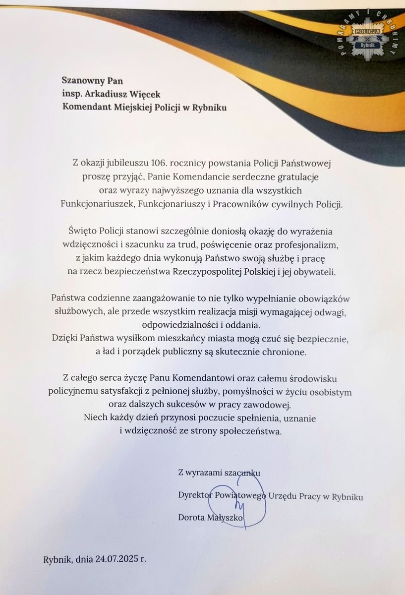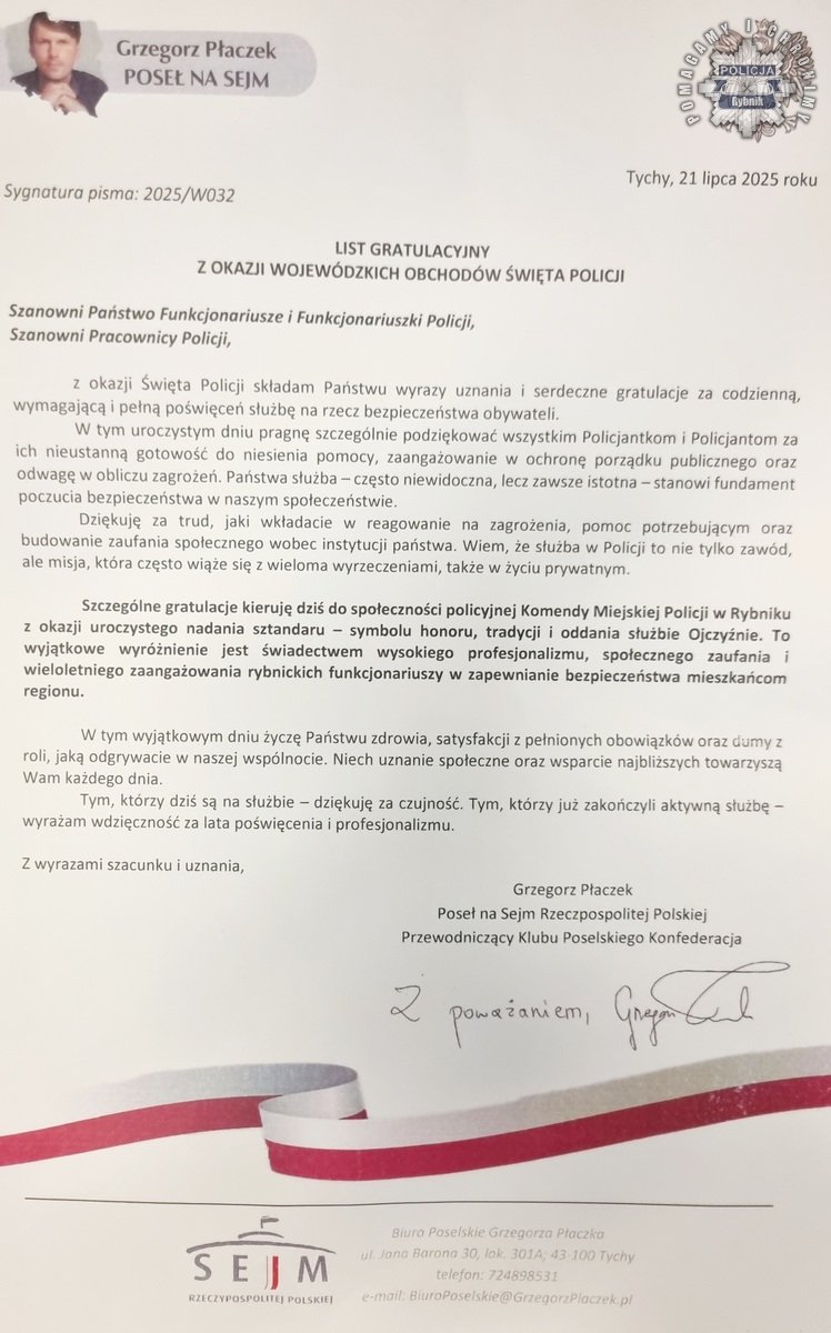 21 lipca 2025 roku na rynku w Rybniku odbyły się Wojewódzkie Obchody Święta Policji – wyjątkowe, bo połączone z ceremonią nadania sztandaru Komendzie Miejskiej Policji w Rybniku, ślubowaniem nowych funkcjonariuszy oraz uczczeniem 100-lecia obecności kobiet w szeregach Policji. Z okazji obchodów Święta Policji, które obchodziliśmy, Komendant Miejski Policji w Rybniku — insp. Arkadiusz Więcek otrzymał listy gratulacyjne oraz podziękowania za codzienną współpracę, trud i poświęcenie, gotowość do działania i profesjonalizm... Życzenia płyną dla policjantek, policjantów oraz pracowników Policji naszej jednostki. Dziękujemy za tak ciepłe słowa...