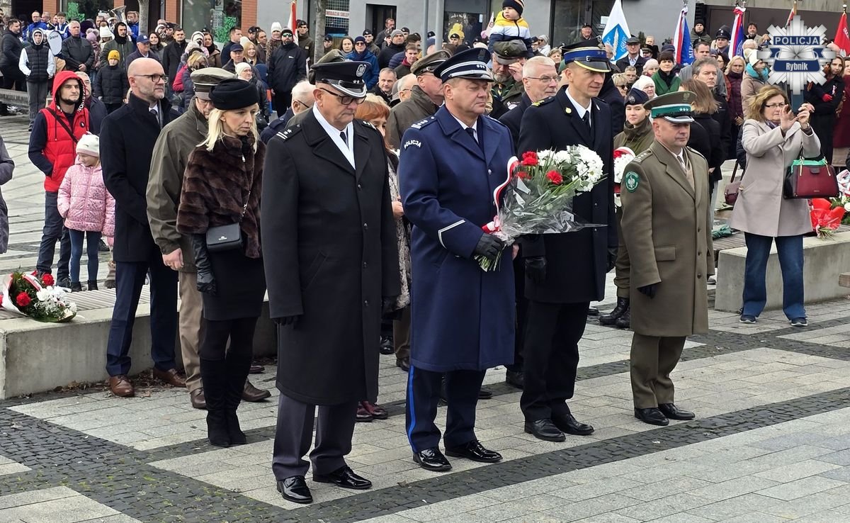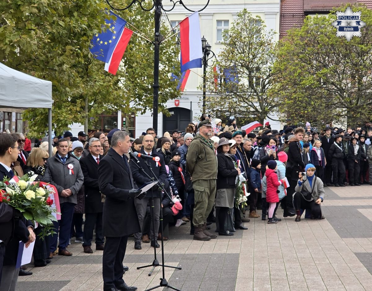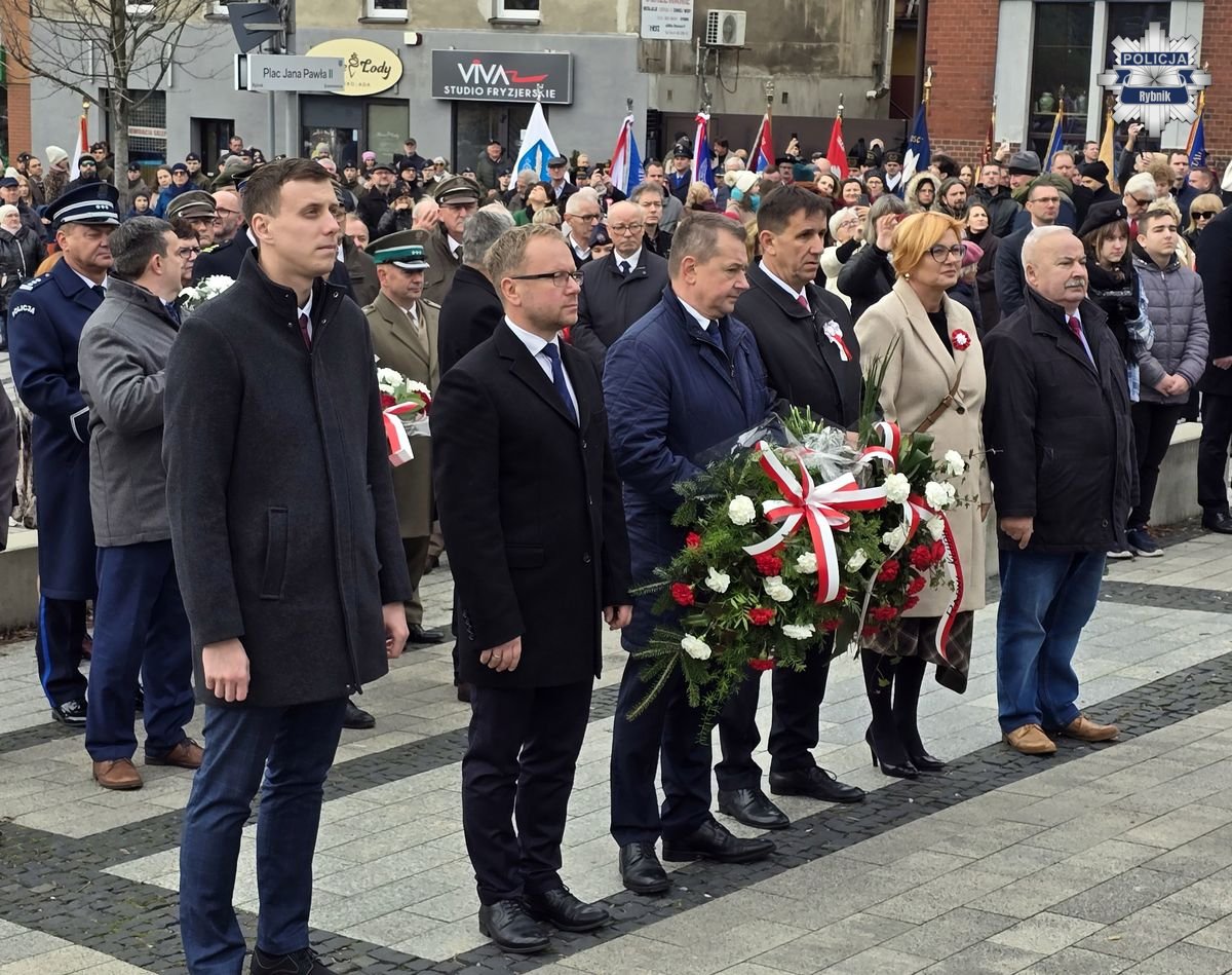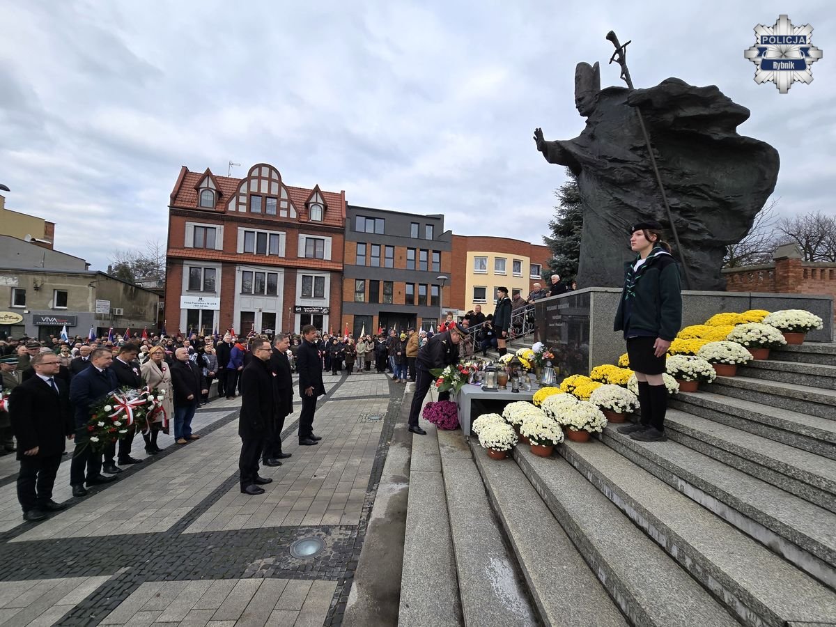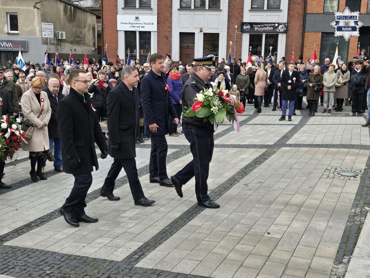Rybnickie obchody Święta Niepodległości przebiegały według tradycyjnego porządku. Po mszy za Ojczyznę w bazylice św. Antoniego, której przewodniczył ks. Marek Noras, prezydent Miasta Rybnika — Piotr Kuczera i jego najbliżsi współpracownicy, a także parlamentarzyści, radni oraz delegacje organizacji społecznych i branżowych złożyli kwiaty pod pomnikiem papieża-Polaka św. Jana Pawła II. W uroczystych obchodach uczestniczyli przedstawiciele służb mundurowych. Podczas uroczystości rybnicką komendę reprezentował Komendant Miejski Policji w Rybniku — inspektor Arkadiusz Więcek. W uroczystościach udział wzięli także przedstawiciele szkół, oraz licznie zgromadzeni mieszkańcy. Na miejskie obchody przybyło wiele rodzin z dziećmi, aby wspólnie uczcić ten wyjątkowy dzień i okazać szacunek dla polskiej tradycji i historii.