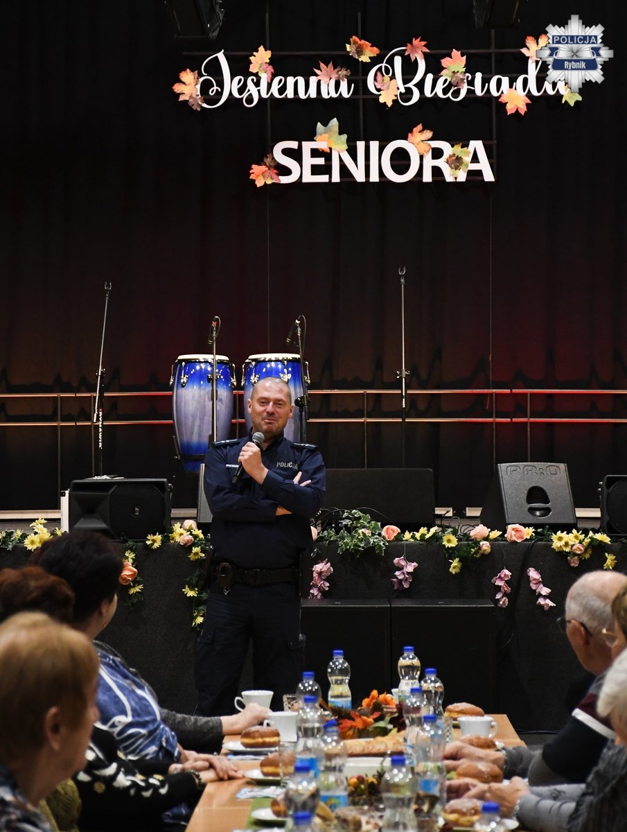 Policjant z rybnickiej komendy wziął udział w Jesiennej Biesiadzie Seniorów, która odbyła się w Klubie Fundacji EDF Polska. Tematem przewodnim spotkania było bezpieczeństwo osób starszych. Uczestnicy mieli okazję dowiedzieć się, jak działają oszuści i jak nie paść ofiarą przestępstwa. Podczas spotkania aspirant Lesław Mandrela przestrzegł seniorów przed domokrążcami oferującymi do sprzedaży tanie towary oraz przypominał o zasadach ograniczonego zaufania wobec obcych osób.