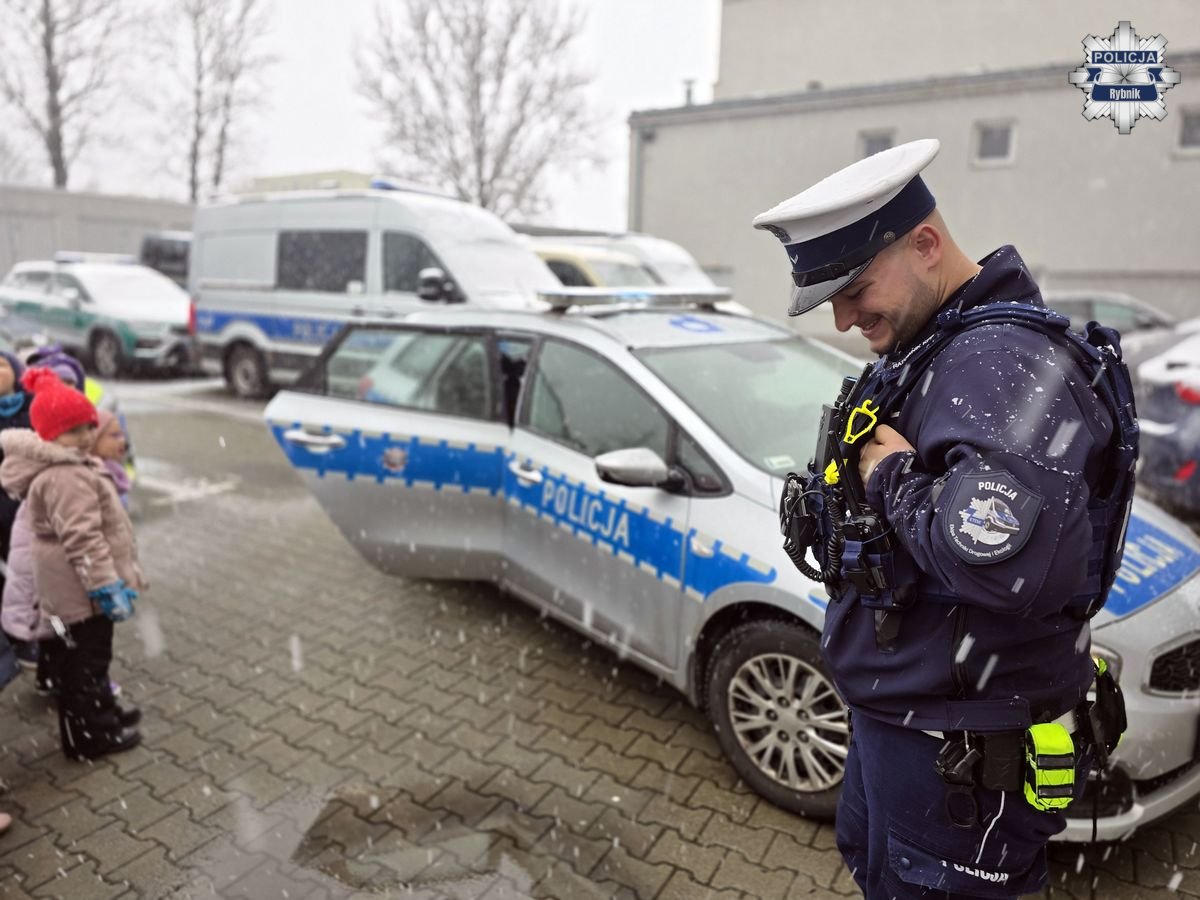 Od kierownicy radiowozu po zabezpieczanie śladów. Takie atrakcje przygotowali policjanci z Komendy Miejskiej Policji w Rybniku dla naszych wyjątkowych gości z Przedszkola nr 1. Podczas spotkania stróże prawa opowiadali przedszkolakom, jak wygląda ich codzienna służba i przedstawiali ciekawe aspekty pracy. Wszystkie dzieci otrzymały odblaski, aby były bardziej widoczne podczas zimowej aury.
