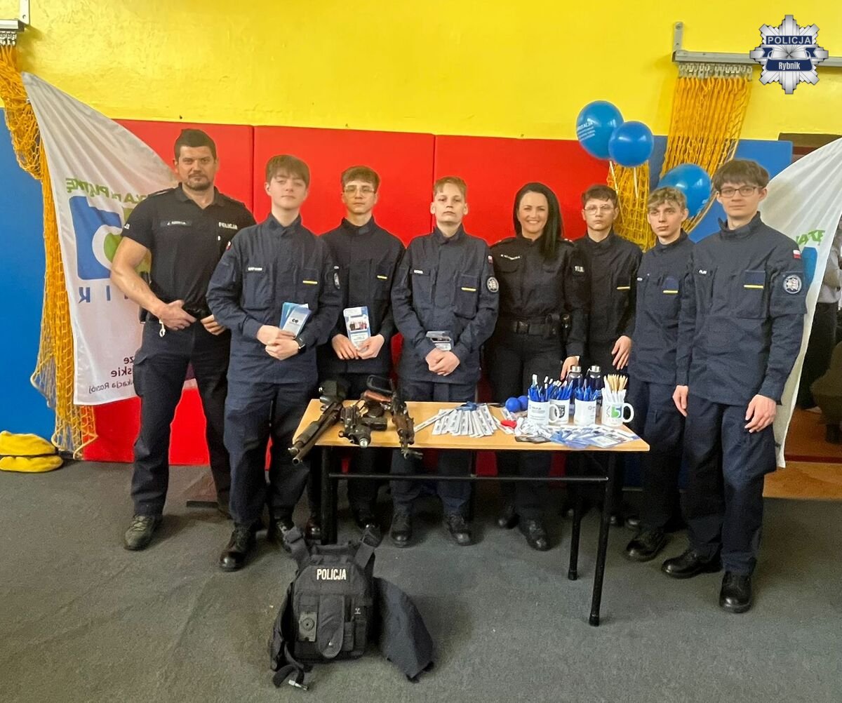Podczas wydarzenia, swoje stoisko informacyjne przygotowali również policjanci z Zespołu Kadr i Szkolenia Komendy Miejskiej Policji w Rybniku. Cieszyło się ono dużym zainteresowaniem wśród uczniów. Ekspert z zespołu kadr i szkolenia – podkomisarz Barbara Klamecka wraz ze starszym aspirantem Kieretą z prewencji opowiadali na szereg pytań oraz przekazywali informacje na temat służby w Policji. Zainteresowana służbą w policji młodzież otrzymała informacje dotyczące wymagań, jakie należy spełnić oraz zostali poinformowani o procedurze kwalifikacyjnej, aby móc podjąć służbę w szeregach największej formacji mundurowej w kraju. Stróże prawa przekazywali także młodzieży informacje do uzyskania jak najlepszych wyników podczas naboru do klasy mundurowej w Zespole Szkół numer 5 im. Józefa Rymera w Rybniku.